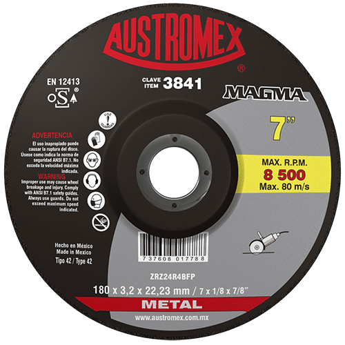 Disco para corte con centro deprimido Dimensiones (in): Dimensiones (mm): Abrasivo: Especi cación: Máx. rpm: Línea: Vel. Máxima: 7 ” x 1/8 ” x 7/8 ” 180 x 3.2 x 22.23 Zirconio ZRZ24R4BFP 8,500 MAGMA 80 m/s