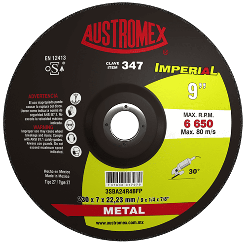 Disco para desbaste con centro deprimido Dimensiones (in): Dimensiones (mm): Abrasivo: Especi cación: Máx. rpm: Línea: Vel. Máxima: 9 » x 1/4 » x 7/8 » 230 x 7 x 22.23 Zirconio y grano cerámico 3SBA24R4BFP 6,650 IMPERIAL